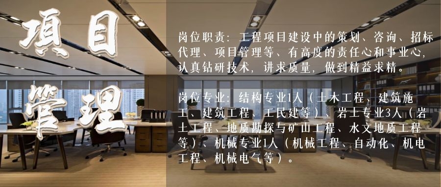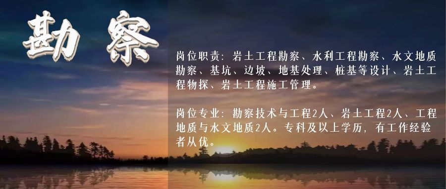 崗位職責:巖土工程勘察、水利工程勘察、水文地質(zhì)勘察、基坑、邊坡、地基處理、樁基等設(shè)計、巖土工程物探、巖土工程施工管理。