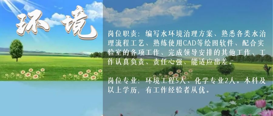 崗位職責:編寫水環(huán)境治理方案、熟悉各類水治理流程工藝、熟練使用CAD等繪圖軟件、配合實驗室的各項工作、完成領(lǐng)導(dǎo)安排的其他工作、工作認真負責、責任心強、能適應(yīng)出差。崗位專業(yè):環(huán)境工程5人、化學(xué)專業(yè)2人。本科及以上學(xué)歷,有工作經(jīng)驗者從優(yōu)。